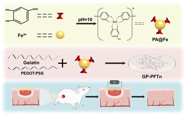 Abstract: Hydrogels possessing both conductive characteristics and notable self-healing to achieve high wound closure effectiveness is highly desirable in clinical applications. In this work, the stretchable?and self-healing conductive?hydrogel dressings were designed through dual-dynamic-bond cross-linking. A stable tricomplex molecule (PA@Fe) could be formed by the pH-sensitive coordinate bond (catechol-Fe) between catechol groups in PA and ferric ions (Fe3+). And the conductive hydrogels with stretchable?and self-healing properties could be fabricated by cross-linking of aldehyde groups in PA@Fe with gelatin through dynamic Schiff base bonds and integration of poly(3,4-ethylenedioxythiophene): poly(styrene sulfonate) (PEDOT:PSS). The as-prepared hydrogels exhibited good self-healing, adhesive ability, biocompatibility, hemostatic and electrical conductivity. The in vivo evaluation in a full-thickness skin wound model revealed the high wound closure effectiveness and post-wound-closure care of the smart hydrogels, demonstrating its great potential in dealing with full-thickness skin wounds.