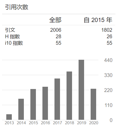 截止2020年5月15日,根據Google學術統計,龔老師的論文被引用次數達到2006次,H指數為28。被引用次數超過50的論文有10篇。