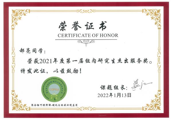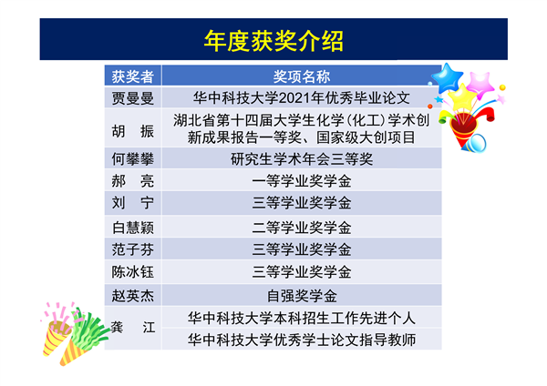 第三,研究生和本科生的培養質量明顯提高。賈曼曼獲得華中科技大學2021年優秀本科生畢業論文,胡振獲得湖北省第十四屆大學生化學(化工)學術創新成果報告一等獎、主持1項國家級大創項目,何攀攀獲得研究生學術年會三等獎,郝亮獲得一等學業獎學金,白慧穎獲得二等學業獎學金,劉寧、范子芬、陳冰鈺三等學業獎學金,本科生趙英杰獲得自強獎學金。