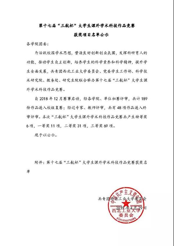 日前,共青團西北工業(yè)大學委員會公示了西北工業(yè)大學第十七屆“三航杯”大學生課外學術科技作品競賽獲獎名單。