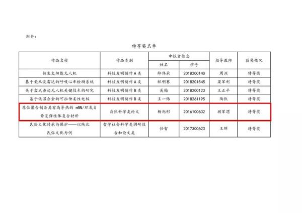 楊旭彤,原位聚合制備具有高導熱的mBN/環(huán)氧自修復彈性體復合材料,自然科學類論文,特等獎;