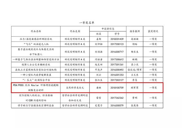 唐林,PDA/POSS改性Kevlar纖維增強氰酸酯樹脂復合材料,自然科學類論文,一等獎;