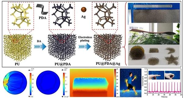 如何制造輕質、良好柔韌性、優異絕熱和電磁干擾(EMI)屏蔽性能的導電聚合物復合材料(ECPCs)是一項巨大的挑戰。本文中,我們通過簡單的生物響應法制備了一種超輕、出色可壓縮回彈、運動感知、優異絕熱和EMI屏蔽性能的聚氨酯@聚多巴胺@銀納米粒子(PU@PDA@Ag)海綿,其可通過兩步獲得:(ⅰ) 多巴胺自聚裝飾在PU海綿表面;(ⅱ) 利用PDA的活性位點,通過化學電鍍使Ag納米粒子原位生長在PU表面。PU@PDA@Ag海綿具有高達84 dB的EMI效能(SE)值,對應的比屏蔽效能(SSE)和絕對屏蔽效能(SSEt)分別為2631 dB cm3/g和5263 dB cm2/g,幾乎優于所有報道的泡沫/海綿的SSE和SSEt。此外,PU@PDA@Ag海綿同時具有超低的密度(0.0226~0.0320 g/cm3)和導熱系數(52.72~63.54 mW/mK),出色的壓縮回彈性以及壓阻特性。出色的綜合性能使PU@PDA@Ag海綿有望應用在輕質、柔性EMI屏蔽領域,如柔性電子設備、智能傳感器、航空航天工程以及軍事防御系統。