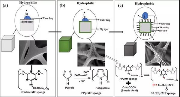 Abstract: Oil spillage poses a serious threat to the marine ecosystem and the environment. This has led to an increasing demand for oil recovery and the quest for effective hydrophobic/oleophilic sorbents for oil-water separation. Herein, we developed polypyrrole (PPy) encapsulated melamine formaldehyde (MF) sponge treated with stearic acid (SA) to obtain a superhydrophobic SA/PPy/MF sponge. The SA/PPy/MF sponge characterized by X-ray diffraction, Fourier transform infrared spectroscopy, and field emission scanning electron microscopy shows that smooth struts of MF sponge get covered with PPy and further SA treatment affords an increased surface roughness and superhydrophobicity which is completely absent in the case of pristine MF sponge treated with either PPy or SA itself. The SA/PPy/MF sponge exhibits contact angles of ~ 170° and 0° by a sessile water and oil droplet on the sponge surface, respectively. Importantly, the SA/PPy/MF sponge demonstrated excellent superhydrophobicity over the entire pH range with absorption capacities reaching up to ~ 70–90 times for various oils from oil-water mixtures