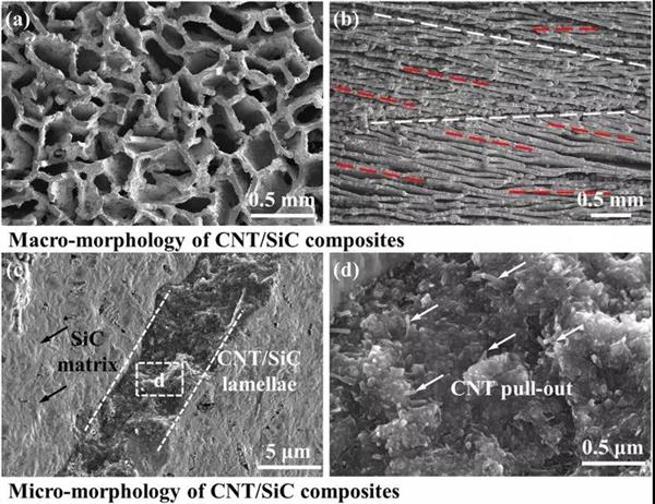 Abstract: Macroscopic carbon nanotube (CNT) self-assemblies are attractive in the field of high-performance composites for taking full advantage of outstanding physical and mechanical properties of individual CNTs at macroscopic level. In this study, macroscopic SiC ceramic matrix composites (CMCs) containing CNTs (CNT/SiC) based on the macroscopic CNT self-assemblies were fabricated using ice-segregation-induced self-assembly technique and chemical vapor infiltration process. The microstructure, macromechanical properties, electrical conductivity, and electromagnetic shielding effectiveness of the fabricated CNT/SiC composites were studied systematically.
