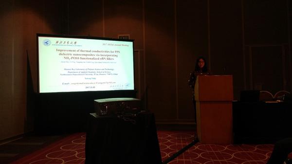 課題組梁超博博士研究生做了題為《Polydopamine stabilized fluorescent nanozinc oixde reinforced epoxy nanocomposites towards UV shielding》的口頭報(bào)告,主要介紹了氧化鋅納米顆粒在紫外吸收方面的應(yīng)用和氧化鋅納米顆粒對環(huán)氧樹脂力學(xué)方面的影響;楊旭彤博士研究生做了題為《Improvement of thermal conductivity for POSS functionalized BN fillers/polyphenylene sulfide composites》的口頭報(bào)告,主要介紹了以硅烷偶聯(lián)劑和單氨基POSS二次表面功能化改性的納米氮化硼為導(dǎo)熱填料,成功制備出低介電聚苯硫醚納米導(dǎo)熱復(fù)合材料;郭永強(qiáng)碩士研究生做了題為《Functionalized Graphene/Polyimide Thermal Conductivity Composites Via Electrospinning-Hot Press Technique》的口頭報(bào)告,主要介紹了以單氨基POSS表面功能化改性的石墨烯為導(dǎo)熱填料,通過原位聚合—靜電紡絲—高溫模壓法成功制備了高導(dǎo)熱聚酰亞胺納米復(fù)合材料。報(bào)告受到了與會專家的肯定,并與專家進(jìn)行了積極的交流和探討。