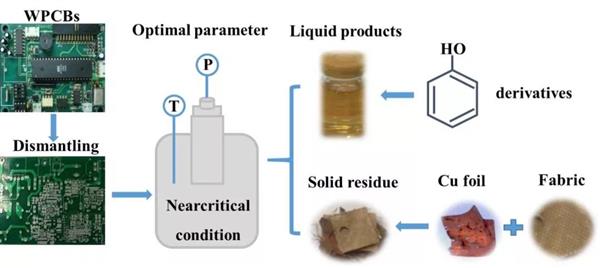 Waste printed circuit board (WPCB), a heterogeneous mixture of brominated epoxy resins (BERs), glass fibers and metals, has the challenge to separate and recover valuable materials. In this paper, an effective and benign near critical water (NCW) method was applied to decompose BERs to recover the glass fabric and metals. The effects of parameters including temperature, reaction time, feed ratio, acid-base catalyst, and size of WPCBs on the decomposition ratio of BERs were investigated. The results showed that the decomposition ratio of BERs reached a maximum value of 98.7% under the optimum conditions at 320 °C, reaction time of 150 min, feed ratio of 5 mL/g, HCl catalyst, and the size of 5×5 mm2. The gas chromatography–mass spectrometry (GC/MS) result showed that the main components of liquid decomposition product were phenol (69.8%) and its derivatives (17.8%). A probable mechanism of the decomposition reaction of BERs was proposed. After NCW treatment, the glass fabric and copper foils in the residue were easily recovered by a simple artificial screening separation. The surface of recovered fabric was very clean and no damages were observed. Meanwhile, the purity of copper foil reached 97.86%. This study provides a green technology to recover valuable materials from WPCBs.