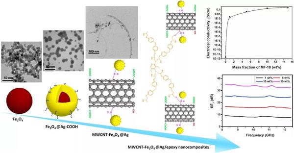 本文創新點:基于“電-磁” 協同效應,設計制備出兼具優異磁性和突出導電性的MWCNT-Fe3O4@Ag復合納米顆粒,有效解決了碳納米管/環氧樹脂共混復合材料屏蔽效能(EMI SE)低的瓶頸問題。