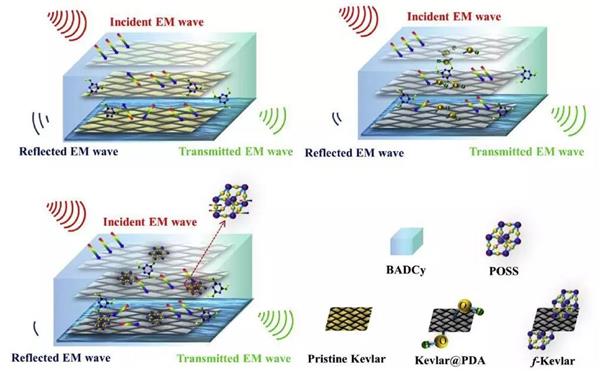 Abstract:Combining method of dopamine/polyhedral oligomericsilsesquioxane (DA/POSS) was firstly performed to functionalize the surface of Kevlar (POSS-g-Kevlar@PDA,f-Kevlar) cloth. And then the corresponding f-Kevlar cloth/bisphenol A cyanate ester (BADCy) matrix wave-transparent laminated composites were successfully fabricated by the method of impregnation, lamination followed by mould pressing. The obtained wave transmission efficiency (T) of 92.0% for f-Kevlar cloth/BADCy wave-transparent laminated composites was higher than that of pristine Kevlar cloth/BADCy wave-transparent laminated composites (T of 88.4%). Flexural strength and interlaminar shear strength (ILSS) of the f-Kevlar cloth/BADCy wave-transparent laminated composites were also significantly increased to 236.3 MPa and 28.5 MPa, increased by 28.8% and 73.7%, in comparison to that of pristine Kevlar cloth/BADCy wave-transparent laminated composites (flexural strength of 183.5 MPa and ILSS of 16.4 MPa), respectively. And the corresponding glass transition temperature (Tg) and heat resistant index (THRI) of the f-Kevlar cloth/BADCy wave-transparent laminated composites was 226.3 °C and 232.8 °C, respectively.
