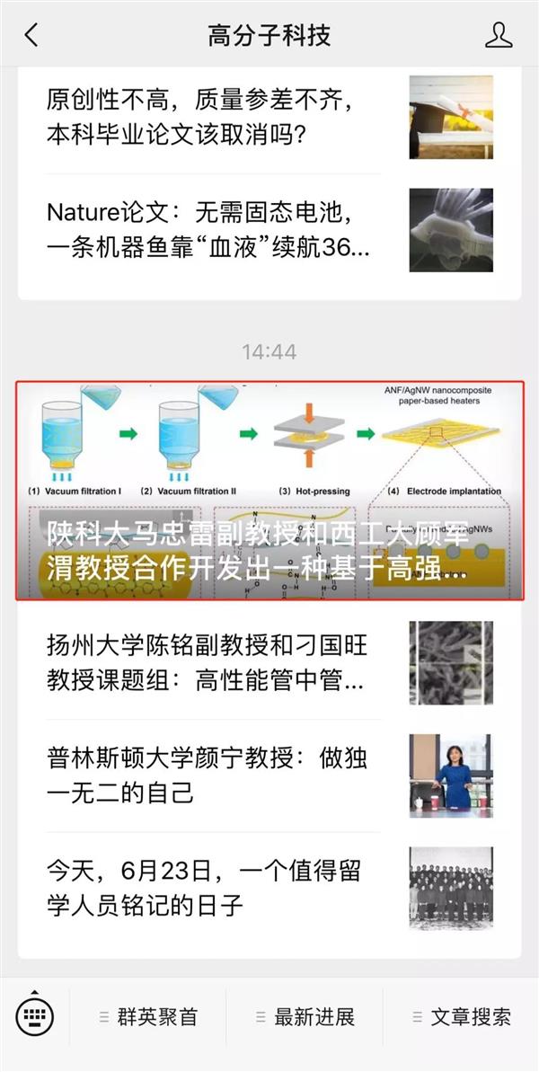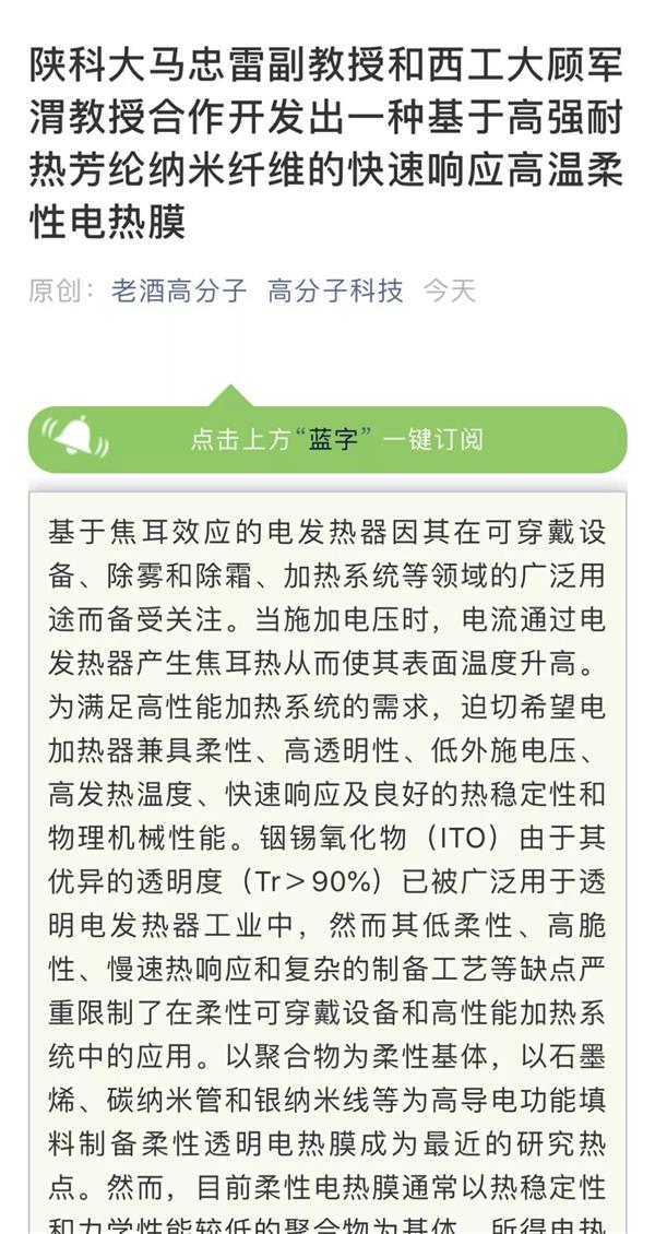 相關(guān)研究成果以“High-Performance andRapid-Response Electrical Heaters Based on Ultraflexible, Heat-Resistant, andMechanically Strong Aramid Nanofiber/Ag Nanowire Nanocomposite Papers”為題發(fā)表在ACS?Nano期刊上(ACS Nano, 2019, doi.org/10.1021/acsnano.9b00434)。陜西科技大學(xué)為論文的第一完成單位,陜西科技大學(xué)馬忠雷副教授為第一作者兼通訊作者,陜西科技大學(xué)馬建中教授、西北工業(yè)大學(xué)顧軍渭教授為本文的共同通訊作者。此研究工作得到國(guó)家自然科學(xué)基金(51773169)、陜西省自然科學(xué)基礎(chǔ)研究計(jì)劃(2018JQ5060;2018JM5001)和陜西省教育廳專項(xiàng)科研計(jì)劃項(xiàng)目(17JK0100)等的支持。