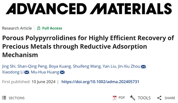 chemical engineering, energy, and electronic devices for a long history of mankind, owing to their excellent properties. Thus, the development of the circular economy of precious metals become highly demanded. In addition to the traditional absence based on the complexation mechanism by using functional groups such as polyamines and thioureas with strong affinity to precious metals, novel absorbents with new absorption modes have attracted much attention in recent years. It is noteworthy that the ultrahigh adsorption capacity was achieved through the reductive capture mechanism, which strongly relies on the advanced adsorbent materials associated with coordination mode.A new family of porous polypyrrolidines (BIT-POP-14–BIT-POP-17) were prepared efficiently through ROMP polymerization by Huang Group, and the as-synthesized BIT-POPs were proved to be highly efficient for the gold recovery from e-waste. The related results were published in the internationally renowned journal Advanced Materials (IF=29 4; Adv. Mater. 2024, 2405731, doi.org/ 10.1002/adma.202405731) under the title of "Porous Polypyrrolidines for Highly Efficient Recovery of Precious Metals through Reductive Adsorption Mechanism".