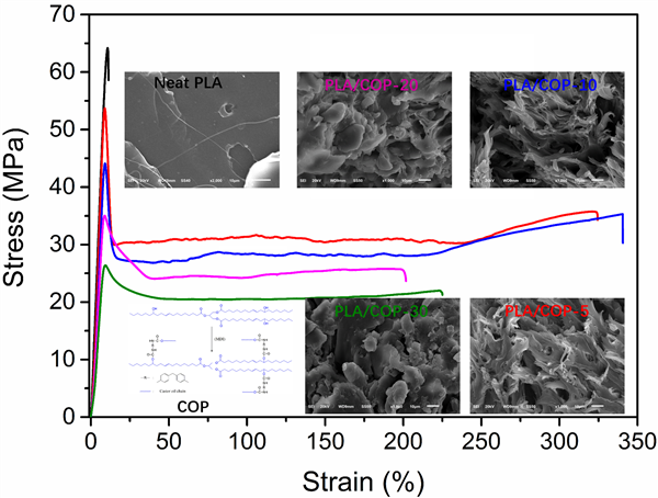 論文摘要:Dynamic vulcanization of biomass-derived castor oil in the presence of 4,4’-diphenylmethane diisocyanate (MDI) in polylactide (PLA) matrix was performed with the aim of toughening PLA sustainably. Crosslinking of castor oil with MDI took place rapidly under dynamic vulcanization conditions, leading to the formation of a tough blend, which showed a phase-separated morphology with castor oil derived polyurethane (COP) as a dispersed phase and PLA a continuous phase. The content of COP in the blends played an important role not only in the size of dispersed COP particles but also in the mechanical properties, rheological and crystallization behaviors of the formed PLA/COP blends. The size of dispersed COP, melt viscosity, and storage modulus of the blends increased significantly with COP content. The crystallization rate of neat PLA was enhanced by incorporation of COP due to the increased nucleation effect arisen from interfacial nucleation of the phase-separated blends. The thermal stability of the blends was slightly reduced compared to neat PLA. The elongation at break of PLA were considerably increased by 45 times to 338%, compared to 7.5% of neat PLA, with addition of only 5 wt% COP, meanwhile, the mechanical strength and modulus were largely remained. Cavitation, arisen from dispersed phase debonding from matrix, induced matrix plastic deformation was the toughening mechanism for the present PLA/COP blends.