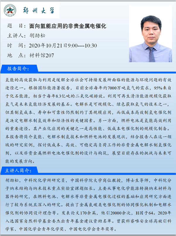 胡勁松教授應邀10月21日蒞臨鄭州大學材料學院進行學術交流