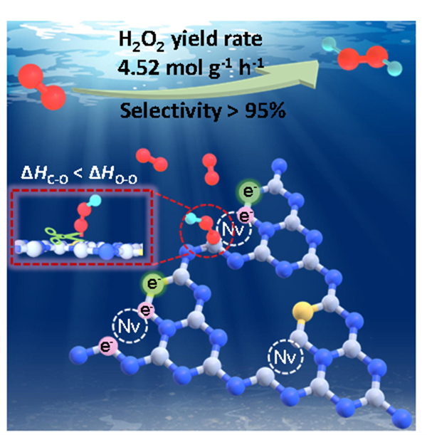氧化氫(H2O2)是一種高效的、生態友好的氧化劑,對化學和醫療行業都有重要貢獻。高能耗的蒽醌循環過程是目前大規模H2O2工業生產的主要方案,但該工藝存在能效低、殘留有機廢物再處理以及散裝過氧化氫運輸存在危險等缺點。雙電子氧還原(2e-ORR)電催化轉化H2O2因其環境友好的優點和通過設備可現場生產H2O2的能力,為綠色H2O2合成提供了一種前景廣闊的替代方法。張佳楠教授團隊以摻硫的富缺陷石墨氮化碳(S-Nv-C3N4)材料為模型,提出了一種通過增強超薄二維氮化碳納米片的鐵磁性來促進局部電子極化的策略。該工作不僅成功實現了大批量(實驗室制備一次100克)高選擇性催化劑的制備技術,并且催化劑產率高達4.52 mol/g/h,累計產生近0.04 mmol/L H2O2(一度電能產生540 g (0.06 mmol) H2O2),顯著推動了高產率低能耗H2O2合成新技術的發展。