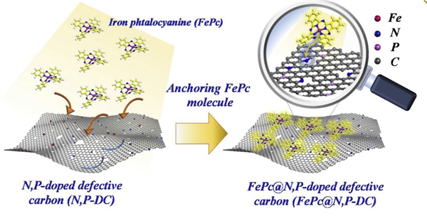 Experimental and computational studies show that topological defect and FeN4 site in carbon materials would deliver high performances for oxygen reduction reaction (ORR) and oxygen evolution reaction (OER). Either defect or FeN4 site attracts numerous discussion, however, the synergetic effect between them is hardly explored. Herein, we design a facial strategy to synthesize N,P-doped defective carbon nanosheets first (N,P-DC), then cover doped sites with well-define metal-N4 macrocyclic molecules (FePc@N,P-DC) through non-pyrolysis process. The defective carbon boosts the high spin state of Fe center, thus brings superior ORR performances with the half-wave potential of 0.903?V and excellent cycling-life stability in alkaline media. Theoretical calculations show that the overpotential of FePc@N,P-DC for ORR is 0.52?V, much lower than 0.80?V (N,P-DC). Interestingly, the OER activity is simultaneously improved. This metal-Pc@defective carbon hybrid opens a door to develop electrocatalysts combining atomically metal-N4 sites with topological defect towards diverse energy conversion type.