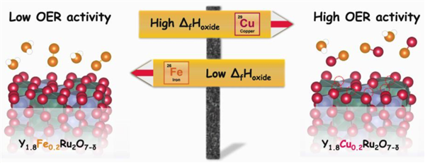 燒綠石結構Ru基催化劑,即成分為A2Ru2O7-δ的氧化物,是最近出現的酸性條件下最先進的氧析出反應(OER)催化劑之一。近日,蘇黎世聯邦理工學院Christoph R. Müller,Alexey Fedorov等將組成為Y1.8M0.2Ru2O7-δ(M = Cu,Co,Ni,Fe,Y)的釔釕燒綠石結構催化劑用于OER,研究了A位點取代對OER的活性影響。