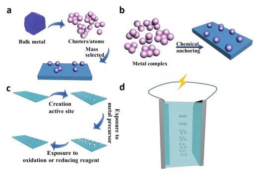 ▲示意圖2. 原子分散金屬的合成方法。a) 質量選擇軟著陸。b) 濕化學合成。c) 原子層沉積。d) 電化學沉積。