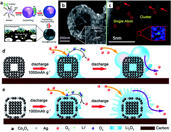 ▲圖7. 原子級分散Ag 活性中心用于鋰氧電池。a) Co3O4@Co3O4/Ag 的合成流程圖。b,c) Ag單原子和原子簇的HRTEM和HAADF-STEM圖。d,e) 電化學生成Li2O2的機理示意圖。
