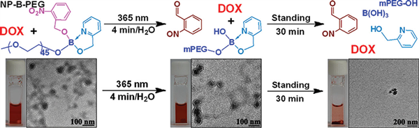Fluorescent photolabile groups undergoing convenient synthesis and fast cleavage are beinexplored because of their increasing utility in both synthetic and biological chemistry. Herein,a model photosensitive poly(ethylene glycol)-lipid of NP-B-PEG with a 2-nitrobenzyl 2-pyridinylmethyl borate hydrophobic tail is synthesized. The 1 H-NMR and absorption spectra analysis of NP-B-PEG upon 365 nm irradiation in water supports a rapid photocleavage of nitrobenzyl borate with the concomitant hydrolysis of 2-pyridinylmethyl borate. It is also shown that the borate tail hydrolyzes slowly in water. Fortunately, when the polymer aqueous solution is loaded with the hydrophobic doxorubicin (DOX), the borate hydrolysis can be much retarded. The phototriggered experiment shows a two-stage DOX release: fi rst, the slow leakage as a result of the photocleavage of 2-nitrobenzyl borate before the vesicle disintegration; second, the quick DOX precipitation from the disintegrated vesicles induced by the speeding up hydrolysis of 2-pyridinylmethyl borate.