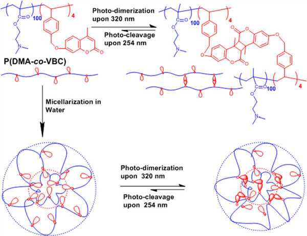 The water-soluble amphiphilic random copolymer of P(DMA-co-VBC) with coumarin pendants has been designed to investigate the photo-induced dynamic association of coumarin pendants within polymer micelles in aqueous solution. Methods of absorption and emission spectra, solution transmittance, dynamic light scattering (DLS), and atomic force microscope (AFM) were applied. It was found that P(DMA-co-VBC) can form polymer micelles in aqueoussolution. The time-dependent photo-dimerization degree(PD) of polymer micelles upon different intensity irradiations of 320 nm light showed saturating behaviors with an intensityindependent value of the maximum photo-dimerization extent, while the maximum photo-cleavage extent of coumarin dimers declined with the increasing intensity of 254 nm irradiationat used conditions. Furthermore, a significant emission band at 445 nm (I2) evidently emerged as against the disappearance of emission band at 385 nm (I1) during the photodimerization, and the time-dependent I2/I1 ratios of polymer aqueous solution upon alternative irradiations of 320 and 254 nm light showed a wave-like increase as a function ofirradiation cycles, indicating a wavy closeness of coumarin pendants within polymer micelles during the reversible photodimerization cycles.
