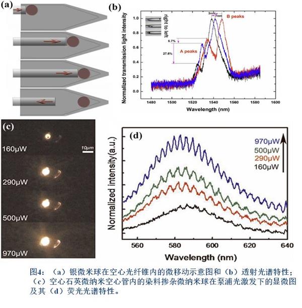 為了探究金屬微納米粒子的表面等離子共振效應(yīng)對空心光纖錐光學(xué)特性的影響規(guī)律,申請人及其團隊成員通過顯微鏡下的微操作手段,在空心光纖錐的錐形空氣微腔內(nèi)連續(xù)移動直徑為2.3μm的銀微米球,同時實驗觀測到了表面等離子諧振峰值的連續(xù)移動,為其光學(xué)傳感器和彩色濾波器的應(yīng)用提供了實驗依據(jù);采用同樣的顯微鏡微操作手段,將直徑約為6μm的激光染料摻雜聚合物微米球灌注進(jìn)直徑為6.2μm的石英微米空心管內(nèi),采用532nm綠光激光器泵浦,實驗研究了其回音壁耦合熒光共振光學(xué)特性,得到的自由光譜范圍為5.4nm;實驗結(jié)果還表明微米球?qū)﹂g的光學(xué)干涉可使單球熒光共振峰產(chǎn)生模式分裂,進(jìn)一步影響其自由光譜范圍等光學(xué)特性參數(shù)。以上涉及的金屬及染料摻雜微納米球和微納米光纖復(fù)合結(jié)構(gòu),有望應(yīng)用于全光調(diào)制器、光學(xué)傳感器等新型微光子學(xué)器件。