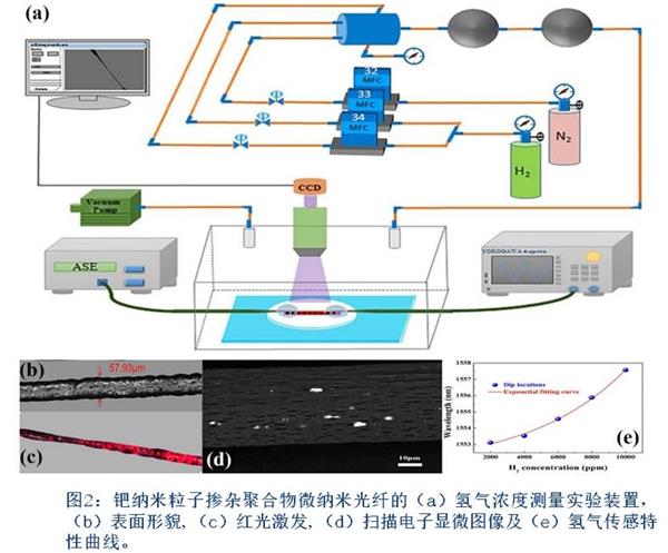 通過將聚甲基丙烯酸甲酯(PMMA)溶于有機溶劑,采用一步拉伸法制備的聚合物微納米光纖的折射率靈敏度為1490nm/RIU,通過將鈀納米粒子摻雜其中,實現(xiàn)了對痕量濃度氫氣的特異性傳感,相應(yīng)靈敏度高達(dá)5.58nm/%,與近年來其他文獻(xiàn)中報道的電化學(xué)類氫氣傳感器的靈敏度相當(dāng),相關(guān)研究獲得遼寧省博士啟動基金項目資助,旨在為研制抗電磁干擾、遠(yuǎn)程工作、高靈敏度、柔韌性強的聚合物微納米光纖氣體傳感器件奠定理論和技術(shù)基礎(chǔ)。