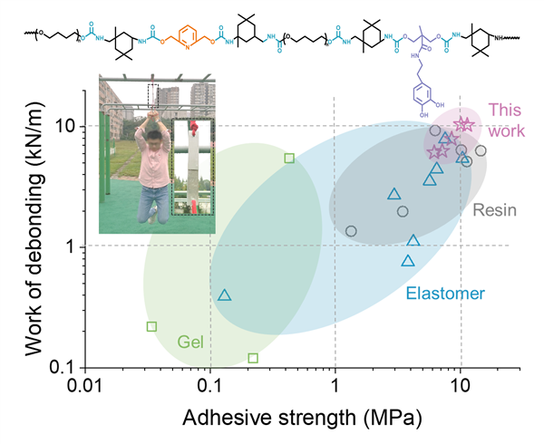 A strain-reinforcing elastomer adhesive with superior adhesive strength and toughness