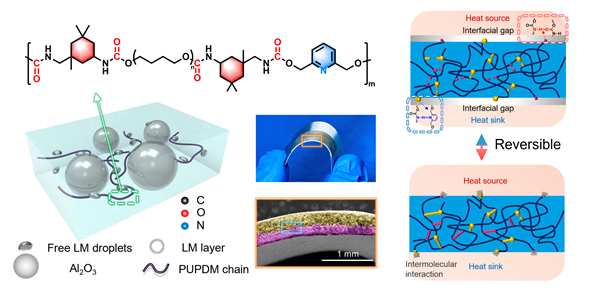 A thermally conductive interface material with tremendous and reversible surface adhesion promises durable cross-interface heat conduction