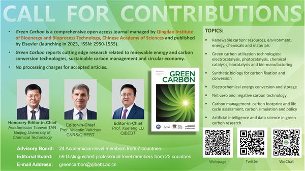 Green Carbon(《綠碳》,ISSN 2950-1555)是由中國科學院青島生物能源與過程研究所創辦、與科愛集團聯合出版的開放獲取英文學術期刊,旨在聚焦碳資源、低碳轉化技術、全生命周期碳管理、以及科研范式變革等主題,推動可持續發展領域的科技創新,打造多學科融合的國際一流學術交流平臺。