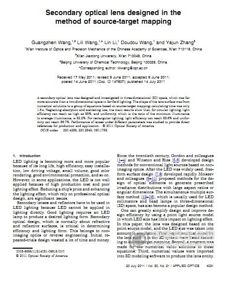 LED在顯示、照明領(lǐng)域,正在逐步取代傳統(tǒng)光源。光學(xué)設(shè)計在LED實際應(yīng)用中至關(guān)重要。 本課題組自2010年9月開始涉足LED照明與顯示領(lǐng)域光學(xué)設(shè)計方面的研究。主要著力點在LED的二次光學(xué)設(shè)計方面,以及醫(yī)用無影燈,路燈的設(shè)計。經(jīng)過不到一年時間的努力,已經(jīng)初見成效。我們撰寫的“Secondary optical lens designed in the method of source-target mapping”論文已在2011年7月20日被刊登在光學(xué)領(lǐng)域權(quán)威雜志Applied Optics( 20 July 2011,Vol.50,No.21,4031-4036)。本研究將程序設(shè)計,三維建模以及光學(xué)模擬仿真完美的結(jié)合起來。論文不但得到了評審人的較高評價,論文中的圖片還被選為本期期刊的封面,這證明了編輯對我們工作的注目。要了解詳情請下載全文:(http://www.opticsinfobase.org/ao/issue.cfm?volume=50&issue=21)。