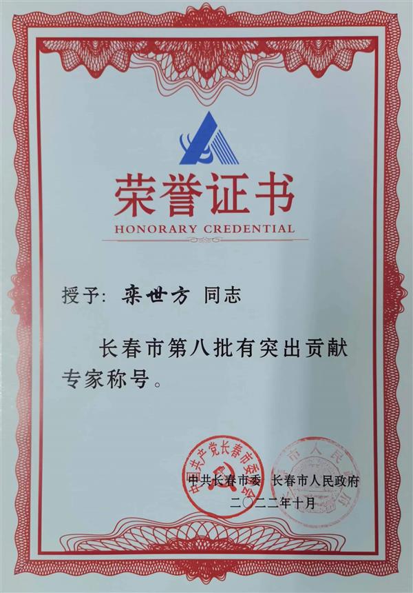 2022年,欒世方研究員獲得長(zhǎng)春市第八批有突出貢獻(xiàn)專家
