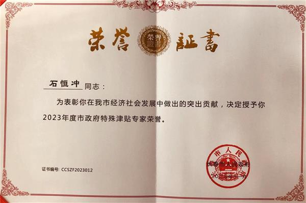 2023年,石恒沖研究員獲得長(zhǎng)春市特殊津貼專家