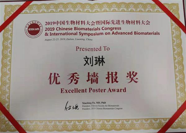 本課題組師生共12人參加本次會議,其中課題組奠基人殷敬華研究員、課題組組長欒世方研究員、石恒沖副研究員及在讀博士生劉琳同學受邀在會議上作邀請報告。同時欒世方研究員受邀擔任“中國生物材料學會生物材料表界面工程分會”第一屆常務委員,劉琳同學獲得“優秀墻報獎”。會議期間,針對目前材料創新發展前沿科學領域問題,與參會人員開展了深入系統的交流。