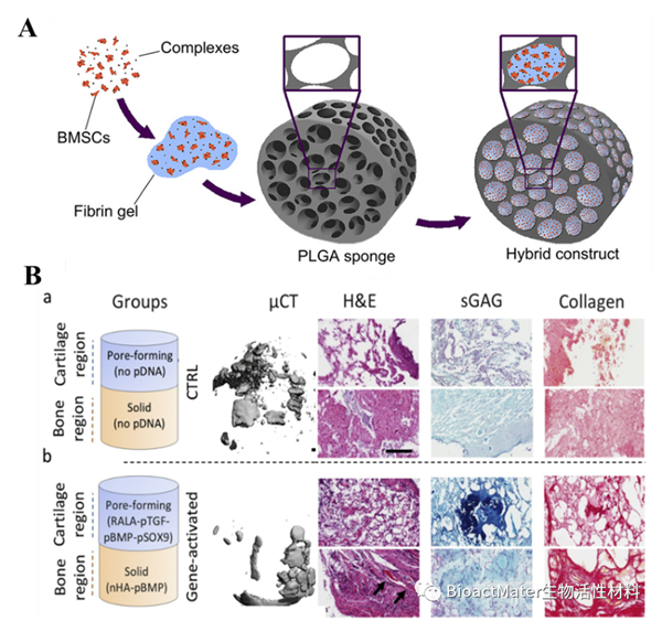 A,PLGA海綿/纖維蛋白凝膠; B,雙層OPF/CMC雜化水凝膠同時遞送成軟骨和成骨基因