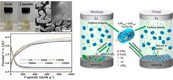 近日,穆海亮同學作為第一作者在Chemical Engineering Journal上發表了題為“Dual functional mesoporous silica colloidal electrolyte for lithium-oxygen batteries”的研究論文,展示了以密排六方介孔二氧化硅粉體制備膠體電解質,在優化鋰負極和正極反應過程,強化鋰氧電池(LOB)綜合性能方面作用。介孔二氧化硅具有可控的形貌、粒度和孔結構、大的比表面積、良好的生物相容性,其低成本、制備工藝簡單,廣泛用于化學吸附、催化應用、環境修復等領域。使用介孔二氧化硅含量為80 mg L-1的膠體電解質,可以使電池壽命從常規LiClO4/DMSO電解質LOB的55個循環延長到328個循環,倍率性能和全放電容量也顯著提高。介孔SiO2膠體電解質的使用大幅度降低了成本,提高了LOB的綜合性能和實用性,對其他鋰金屬電池的研究也具有一定的借鑒與指導意義。