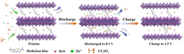 Methylene blue intercalated vanadium oxide (HVO-MB) is designed as an organic-inorganic hybrid cathode for zinc-ion batteries, exhibiting promising electrochemical performances with synergistic energy storage between reversible Zn2+ intercalation and coordination reaction mechanism.