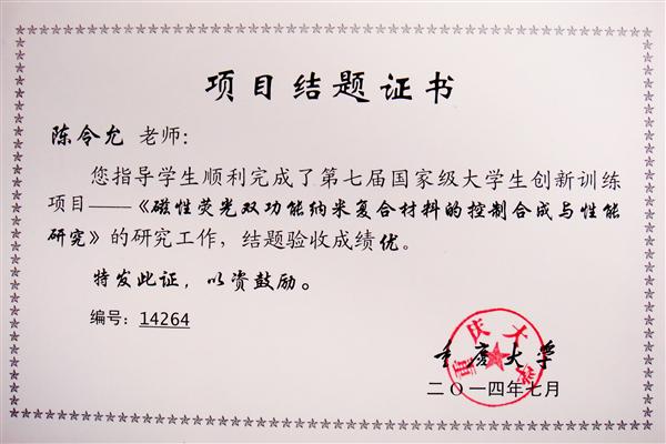 指導(dǎo)的七屆國家大學(xué)生創(chuàng)新訓(xùn)練項目(2013年,項目編號:201310611042,項目組成員:陳銳、袁敏和龔俊燁)結(jié)題驗收成績“優(yōu)”,其中陳銳同學(xué)以優(yōu)異的成績被保送浙江大學(xué)高分子唐本忠院士課題組,袁敏同學(xué)以優(yōu)異的成績被保送中國科學(xué)院大連化學(xué)物理研究所包信和院士課題組。