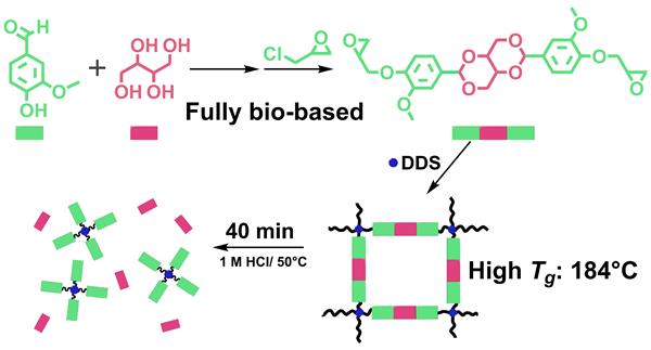 Thermosets are very versatile owing to their high dimensional stability, chemical resistance and thermal and mechanical properties; however, they are difficult to be recycled or reworked because of their permanent cross-linked structure. In this paper, we synthesized a novel fully bio-based diepoxy monomer via acetalization of lignin derivative vanillin with bio-based polyol erythritol followed by reacting with bio-derived epichlorohydrin. Due to the degradability of dicyclo diacetal structure in the diepoxy monomer, the cross-linked epoxy network could be readily decomposed (completely dissolved in 1M HCl solution at 50 °C within 40 min). While it was stable under neutral and basic conditions even during hot-humid aging test. Meanwhile, due to the rigidity of the dicyclo diacetal structure, it showed high glass transition temperature of 184 °C, and its modulus (4.7 GPa) and hardness (0.30 GPa) are even higher than those of conventional bisphenol A epoxy resin.