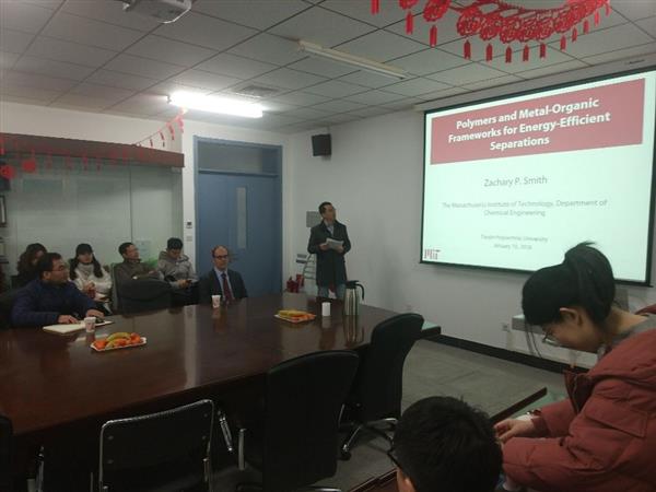 2018年1月10日,應課題組邀請,麻省理工學院化學工程系的副教授,Joseph R. Mares職業發展協會主席Zachary P. Smith來我校交流訪問。期間Zachary P. Smith教授為我校師生作了題為“Membranes for Energy-Efficient Separations”的學術報告,報告會由孟建強教授主持。分離膜科學與技術國際聯合研究中心主任李建新教授出席了會議。參會人員還有來自膜重點實驗室、材料學院、紡織學院和環境學院60余名師生。