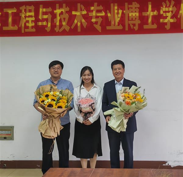 上圖:付秋菊同學在做博士答辯PPT匯報,下圖是答辯通過后與兩位博導合影