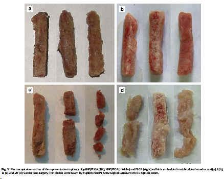 [Abstract]: Nanocomposite of hydroxyapatite (HAP) surface-grafted with poly(l-lactide) (PLLA) (g-HAP) shows a wide application for bone fixation materials due to its improved interface compatibility, mechanical property and biocompatibility in our previous study. In this paper, a 3-D porous scaffold of g-HAP/poly(lactide-co-glycolide) (PLGA) was fabricated using the solvent casting/particulate leaching method to investigate its applications in bone replacement and tissue engineering. The composite of un-grafted HAP/PLGA and neat PLGA were used as controls. Their in vivo mineralization and osteogenesis were investigated by intramuscular implantation and replacement for repairing radius defects of rabbits. After surface modification, more uniform distribution of g-HAP particles but a lower calcium exposure on the surface of g-HAP/PLGA was observed. Intramuscular implantation study showed that the scaffold of g-HAP/PLGA was more stable than that of PLGA, and exhibited similar mineralization and biodegradability to HAP/PLGA at the 12-20 weeks post-surgery. The implantation study for repairing critical radius defects showed that the scaffold of g-HAP/PLGA exhibited rapid and strong mineralization and osteoconductivity, and the incorporation of BMP-2 could enhance the osteogenic process of the composite implant. The new bone formation with the intact structure of a long bone was guided by the implant of g-HAP/PLGA.