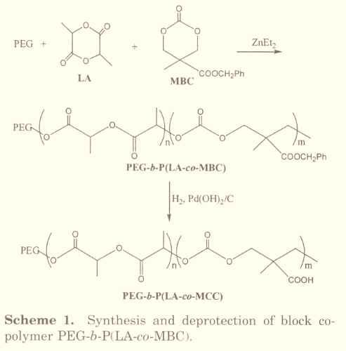 2-methyl-2-benzoxycarbonyl-propylene carbonate) [PEG-b-P(LA-co-MBC)], was synthesized in bulk by the ring-opening polymerization of L-lactide with 2-methyl-2-benzoxycarbonyl-propylene carbonate (MBC) in the presence of poly(ethylene glycol) as a macroinitiator with diethyl zinc as a catalyst. The subsequent catalytic hydrogenation of PEG-b-P(LA-co-MBC) with palladium hydroxide on activated charcoal (20%) as a catalyst was carried out to obtain the corresponding linear copolymer poly(ethyleneglycol)-blockpoly(L-lactide-co-2-methyl-2-carboxyl-propylenecarbonate) [PEG-b-P(LA-co-MCC)] with pendant carboxyl groups. DSC analysis indicated that the glass-transition temperature (Tg) of PEG-b-P(LA-co-MBC) decreased with increasing MBC content in the copolymer, and Tg of PEG-b-P(LA-co-MCC) was higher than that of the corresponding PEG-b-P(LAco-MBC). The in vitro degradation rate of PEG-b-P(LA-co-MCC) in the presence of proteinase K was faster than that of PEG-b-P(LA-co-MBC), and the cytotoxicity of PEG-b-P(LA-co-MCC) to chondrocytes from human fetal arthrosis was lower than that of poly(L-lactide).