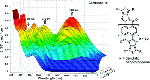 Soluble, film-forming near-infrared arylene bisthienoimidazole dyes with a band gap of 1.2–1.3 eV are electrochromic and absorb strongly at the telecommunication wavelengths (1310 and 1550 nm) in the oxidized state.