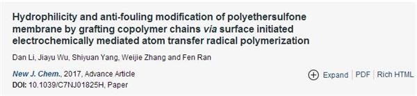 祝賀我組李丹在“New Journal of Chemistry”上發表題為“Hydrophilicity and anti-fouling modification of polyethersulfone membrane by grafting copolymer chains via surface initiated electrochemically mediated atom transfer radical polymerization”的文章