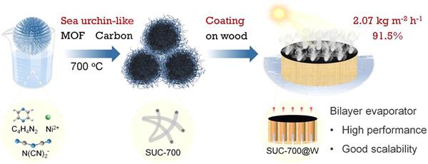Solar evaporation is considered as a hopeful technology for producing freshwater from non-potable water using inexhaustible solar energy. However, solar evaporators with high performance and good scalability are still urgently needed. Herein, a bilayer solar evaporator is prepared by facilely coating natural wood with carbon materials pyrolyzed from sea urchin-like metal-organic frameworks (MOFs). The carbon materials inherit the sea urchin-like morphology and grow bamboo-like carbon nanotubes wrapping Ni nanoparticles, which synergistically contribute to the efficient light trapping and thermal harvesting. Meanwhile, the doped nitrogen and oxygen enhance the hydrophilicity of carbon materials. In another aspect, wood not only provides abundant hydrophilic channels for sufficient water supply, but also reduces the water evaporation enthalpy by 26% through the hydrogen bonds between water and hydrophilic groups of wood. With the combined merits above, the bilayer solar evaporator achieves high sunlight absorption (98%), low thermal conductivity (0.17 W m-1 K-1), rapid water transport, and low vaporization enthalpy. Consequently, the solar evaporator exhibits a notable water evaporation rate of 2.07 kg m-2 h-1 under 1 Sun irradiation, surpassing that of reported MOFs or wood-based evaporators. Importantly, a large-scale solar desalination device is developed for outdoor experiments to obtain freshwater from seawater. The daily freshwater production amount per unit area (2.74 kg) meets the daily water consumption requirement of one adult. This work states the great potential of MOFs-derived carbons for efficient solar vapor generation and opens an avenue for application in energy storage and conversion.
