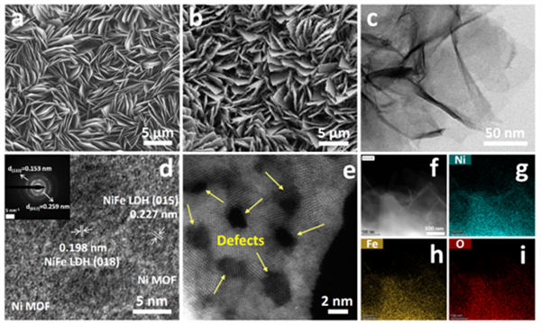 圖3. NiFe-LDH/MOF異質結構材料的形貌和結構表征。