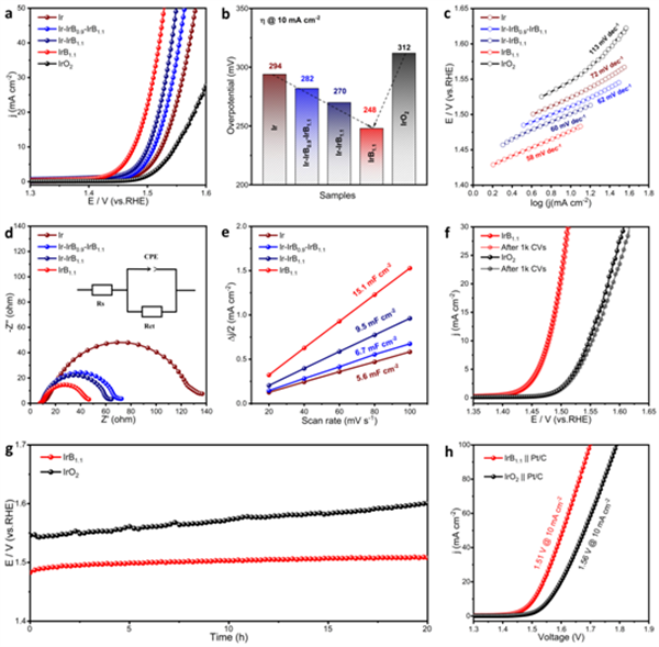 圖3 IrB1.1的OER性能研究極化曲線表明,IrB1.1具有良好的OER活性(248 mV @10 mA cm-2)。Tafel圖和Nyquist圖顯示,與對照樣品相比,IrB1.1電荷轉移電阻(Rct)降低,說明B的參與提高了IrB1.1的OER動力學過程。在OER穩定性方面,IrB1.1和商業IrO2在1000 圈CV循環前后的極化曲線和計時電流曲線表明,IrB1.1比商業IrO2具有更好的加速降解穩定性和長期循環耐久性。