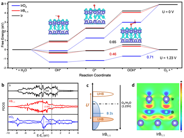 圖5 IrB1.1的OER活性起源分析為了更深入地了解IrB1.1金屬間化合物增強的OER性能,進一步構建了包括IrB1.1、IrO2和Ir在內的相關結構模型,并進行了密度泛函理論(DFT)計算。如圖5a所示,在1.23 V時,OOH*在IrO2上生成O2是速率決定步驟(RDS),其自由能差為0.71 eV;而對于Ir和IrB1.1的RDS為O*到OOH*的轉化。很明顯,在Ir晶格中引入間隙B大大降低了RDS的勢壘。同時,與IrO2相比,IrB1.1對含氧中間體的吸附減弱,這也解釋了為什么IrB1.1具有比IrO2更好的OER活性。