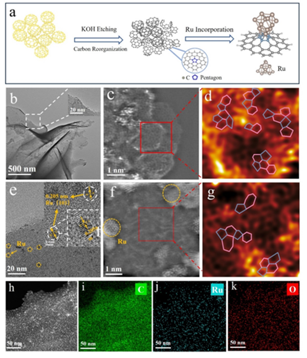 為了驗證理論計算結果,實驗制備了富五元環缺陷的碳材料。首先選擇具有本征五元環結構的C60作為原材料,對其進行堿刻蝕構建富五元環碳(PRC)。其次,通過濕化學法和熱還原法將活性Ru物種錨定在PRC框架上,獲得了目標產物(Ru@PRC)。再以同樣的合成手段刻蝕石墨烯材料,獲得含有常規六元環碳的材料(HC)和Ru@HC。AC-STEM圖像顯示PRC保留了大量的本征五元環缺陷,引入Ru物種后,碳前驅體的整體形態并未發生明顯改變,Ru團簇(尺寸小于2 nm)均勻地分布在碳基底上。