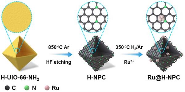 近日,武漢理工大學(xué)木士春教授帶領(lǐng)研究團(tuán)隊(duì),通過(guò)對(duì)空心金屬有機(jī)框架進(jìn)行直接碳化和隨后的 HF 刻蝕制備了 N 摻雜的中空多孔碳,并將超細(xì)的 Ru 團(tuán)簇限域其中。具體而言,作者們通過(guò)直接碳化空心金屬有機(jī)框架 (H-MOFs)、HF 蝕刻和錨定釕 (Ru) 團(tuán)簇,構(gòu)建了一種氮 (N) 摻雜的中空碳 (H-NPC) 負(fù)載 Ru 團(tuán)簇 (c-Ru@H-NPC) 催化劑。